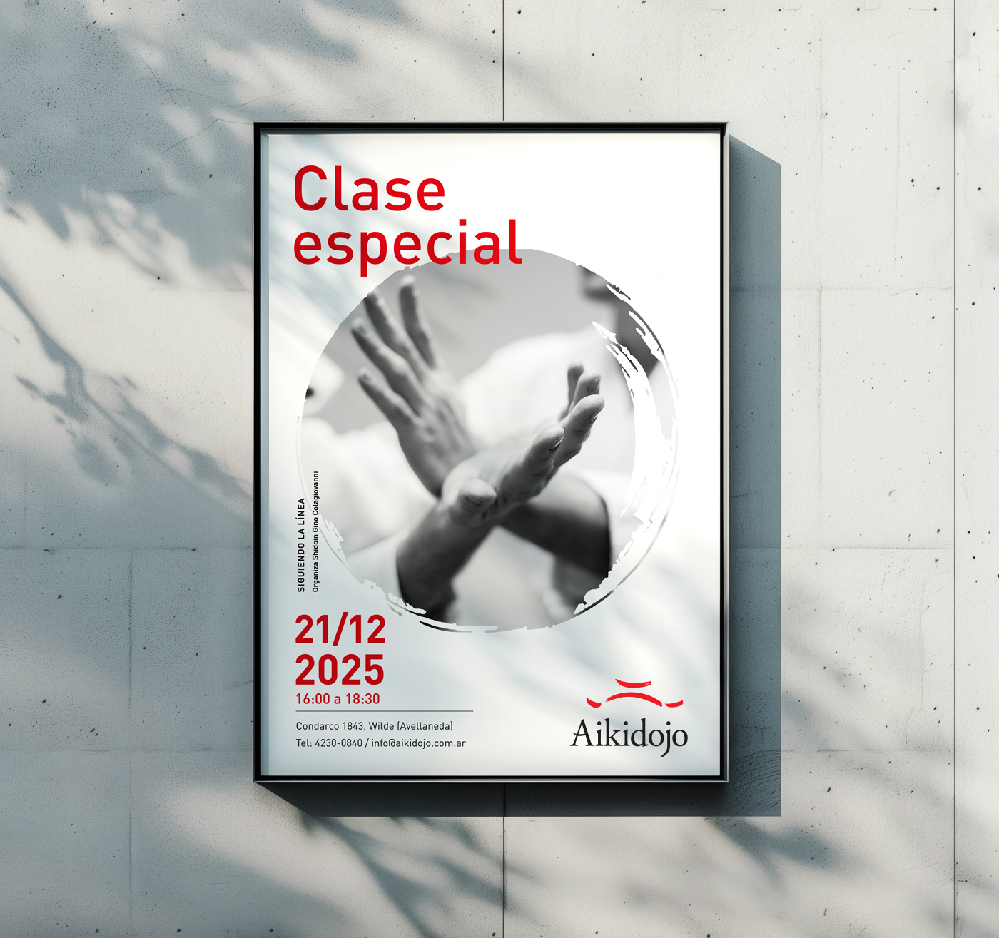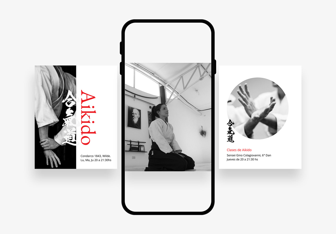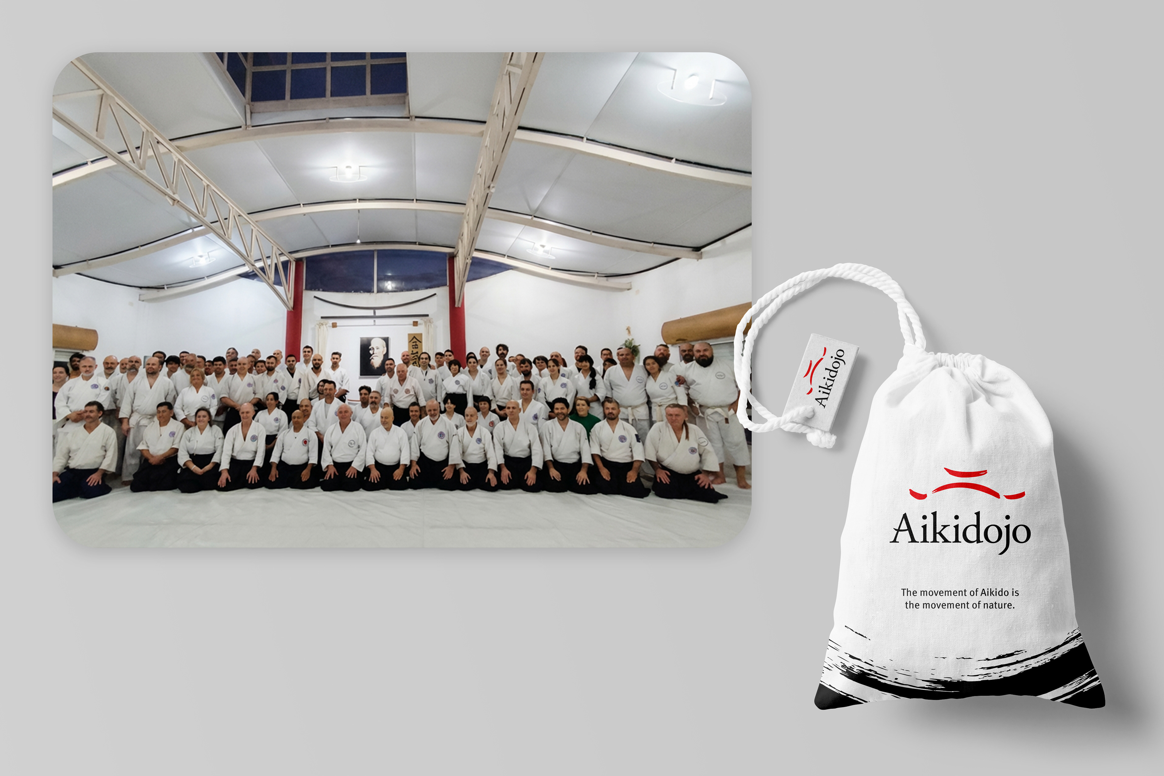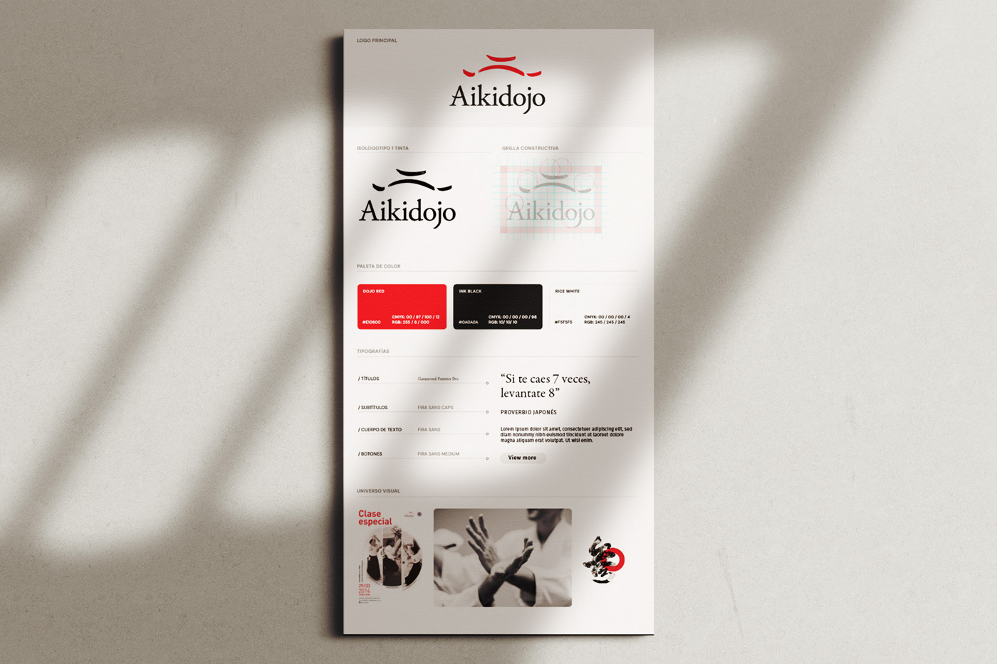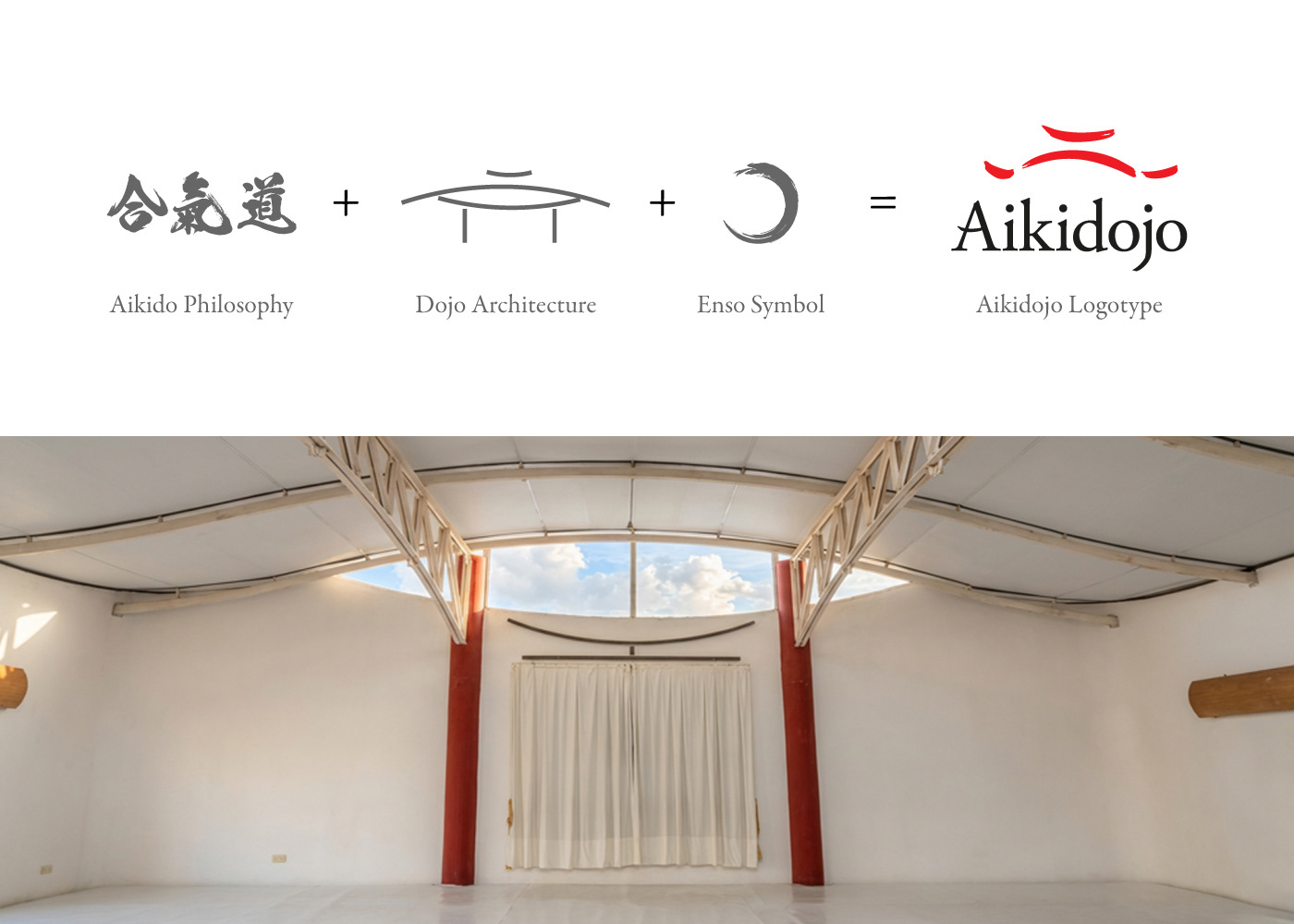 La identidad de Aikidojo se construye a partir de la filosofía del Aikido, la arquitectura del dojo y el símbolo japonés del Enso. El signo abstrae la forma del techo del espacio y la tipografía incorpora trazos inspirados en la pincelada japonesa.