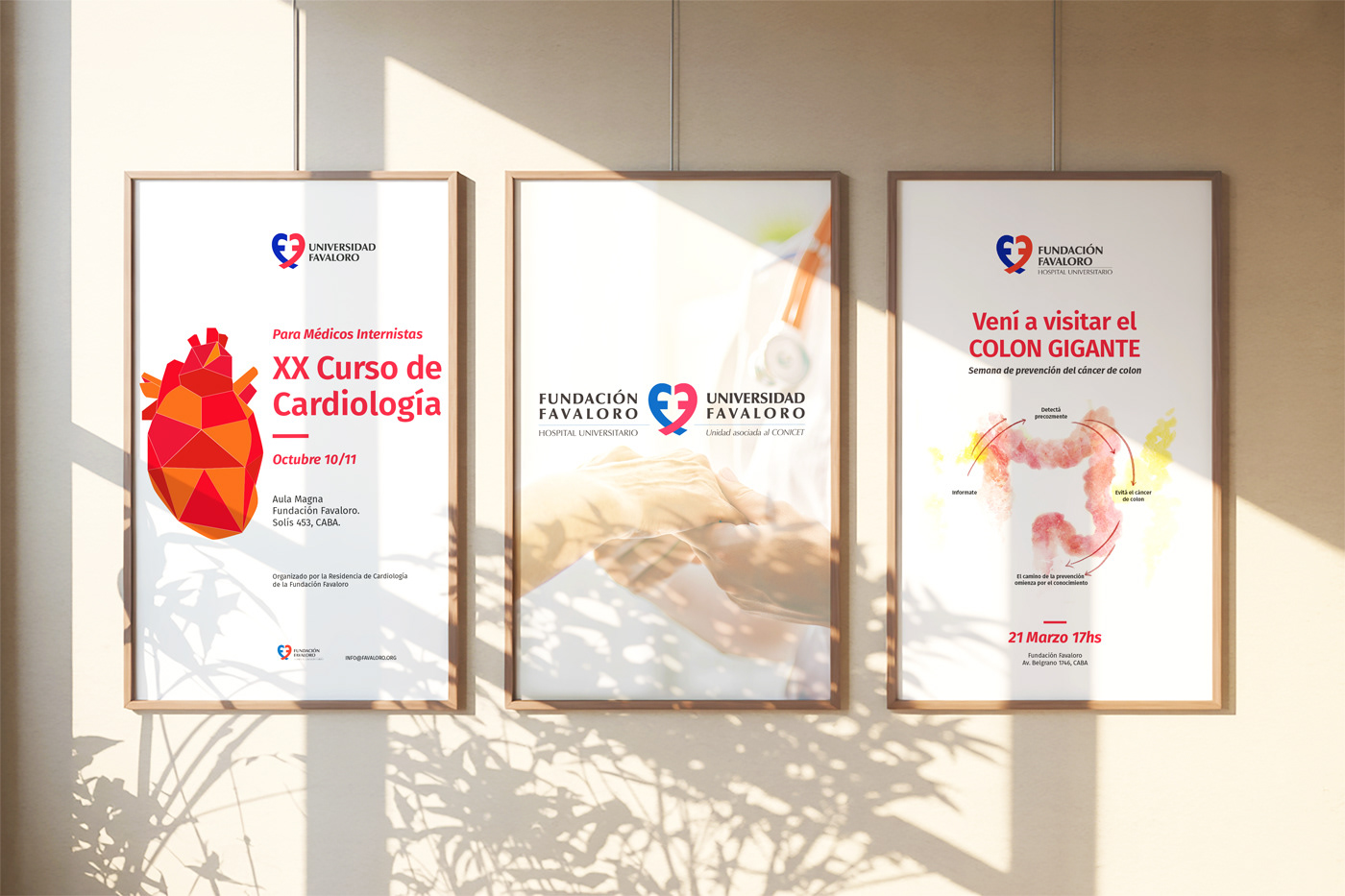 Este proyecto presenta el trabajo de comunicación institucional desarrollado para el Hospital y la Universidad de la Fundación Favaloro, incluyendo afiches para eventos, piezas para congresos médicos, comunicación interna y papelería.